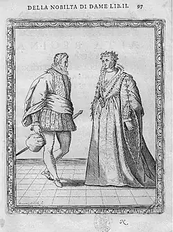 Franco is also the author of two series of engravings dedicated to showing Venetian costumes in all their variety and richness, to demonstrate the power and luxury of the Venetian Republic: Habiti delle done venetiane intaggliate a Roma and Habiti d'huomeni et donne venetiane con la processione della Serma. Signoria et altri particolari cioé trionfi feste e cérimonie publiche della nobilissima città di Venetia, Venice, 1610.[2]