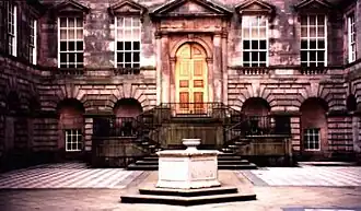 In the early 1720s, Leoni received one of his most important challenges: to transform a great Elizabethan house, Lyme Hall, into a Palladian palace.[6] This he did so sympathetically that internally, large areas of the house remained completely unaltered, and the wood carvings by Grinling Gibbons were left intact. In the central courtyard Leoni achieved the Palladian style by hiding the irregularities and lack of symmetry of the earlier house in a series of arcades around the courtyard.