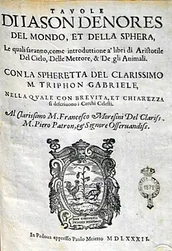 - Tavole di Iason Denores del mondo, et della sphera, le quali saranno, come introduttione a' libri di Aristotile del cielo, delle meteore, & de gli animali. Con la spheretta del clarissimo m. Triphon Gabriele, nella quale con brevità, et chiarezza si descrivono i cerchi celesti... In Padova: appresso Paulo Meietto, 1582. 1582.