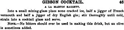 Other pre-Prohibition recipes all omit bitters and none of them garnish with an onion. Some garnish with citrus twists. Others use no garnish at all. There is no known recipe for the Gibson garnished with an onion before William Boothby's 1908 Gibson recipe.[2]