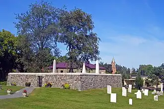There are 161 marked graves scattered around the property, in no regular pattern. Most headstones are of marble or granite; some are unadorned and others show common 19th-century funerary art such as urn-and-willow motifs. On a rise in the north central portion is the Putnam family plot, surrounded by a fieldstone wall with smooth stone coping. Access to it is provided by a wrought iron gate with stone lintel. The graves of Gideon Putnam and his wife are marked by obelisks.[1]