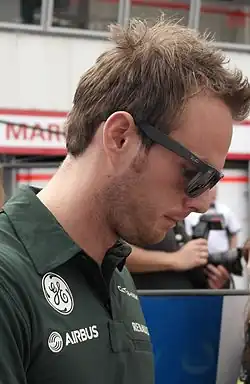 Born and raised in Rhenen, van der Garde began competitive kart racing aged nine. After a successful karting career—culminating in his victory at the direct-drive Karting World Championship in 2002—van der Garde graduated to junior formulae. He won his first championship at the 2008 Formula Renault 3.5 Series with P1. After four seasons and several wins in the GP2 Series, van der Garde signed for Caterham in 2013, having previously tested for Super Aguri and Spyker, as well as being a member of the McLaren Young Driver Programme in 2006. Van der Garde made his Formula One debut at the Australian Grand Prix, but Caterham failed to score points all season with the CT03, with van der Garde finishing a career-best 14th in Hungary. Failing to retain his seat for 2014, van der Garde signed for Sauber as a reserve driver. Despite being contracted as a full-time driver for 2015, Sauber signed Felipe Nasr, resulting in a multi-million pound settlement after van der Garde sought international arbitration.