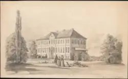 A one-story main building was constructed for Countess Anna Sophie Schack between 1750 and 1751. In 1843, it was extended with an additional story. Both facades feature a triangular pediment.