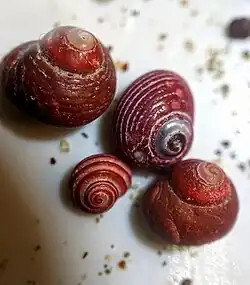 The height of the shell varies between 6 mm and 10 mm. Its color is red, ashen or purple. The small, globose shell is very solid and imperforate. The spire is conic, more or less depressed. The suture is moderately impressed. There are five whorls. These are slightly convex, the last decidedly deflected toward the aperture, encircled by about fifteen subequal spiral lirae, separated by interstices about as wide as the ridges. The incremental striae are generally strongly developed, causing the liree to appear nodose or somewhat irregular, and the interstices to appear pitted. The oblique aperture is pearly white within. It measures about half the length of shell. The columella is arcuate. The base of the shell is obsoletely uni- bi- or tri-dentate. The rounded oval operculum is nearly smooth and slightly concave in the middle.[4]