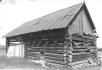 The barn does not have a foundation. The walls are constructed from hewn logs that are assembled using a double box notch technique. The roof has gable ends and is covered with corrugated metal.[2] The barn is primarily made of hewn logs, including the attic walls and the loft cross beams.[2]
