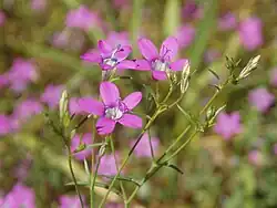 The top of the stem is an inflorescence of a few pink to lavender flowers with yellow and white throats. The base of the flower is a thin, glandular tube.