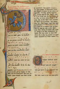Gilles had an amicable literary relationship with Gace Brulé, Conon de Béthune and Pierre de Molins. Gace addressed three songs to him as Gillet/Gillés/Gilet; Conon addressed him in one song as Gilon; and Pierre addressed him once as Gilet. Prior to 1201, they engaged in a literary debate about love and whether it was possible to sing without it.[3] In his piece Chanter m'estuet, car pris m'en est corage (I Must Sing for I Desire to Do So), Gilles answers in the affirmative, as against his friends, saying "I will sing without love, out of habit" (si chanterai sanz amors, par usage).[4] Gilles thus became famous for his opposition to the ideal of courtly love. The debate came to include Gautier de Coinci, Blondel de Nesle and the Chastelain de Couci. All took a stand against Gilles's "notorious anticourtliness".[5]