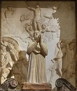 In the Santa Maria dell'Anima in Rome he and Mostaert collaborated from 1576 to 1579 on marble reliefs for the tomb of Duke Karl Friedrich of Jülich-Cleves-Berg. This monument was designed by the Duke's tutor Stephanus Winandus Pighius.[15] The monument was dismantled in 1750 and the remaining parts of it are now located at various locations in the church. The principal section shows, among other things, a scene of the Last Judgement, with some male nudes that cite the famous Laocoön and His Sons sculpture discovered in 1506. According to Baglione, the central relief with the Last Judgment was flanked by statues of religion and faith on the right and left, all set in columns, niches, frontons; above a bas-relief with the presentation of a staff of honor to the Duke and two putti to the side. On a sarcophagus, kneeling, was a statue of the Duke. The Last Judgment and the statue of the Duke are still there. The relief of the Last Judgment was worked in two parts. The lower part and the figure of the duke are by Mostard. In niches there are Wisdom and Christian Love, coming from a tomb of Cardinal Andrew of Austria.[16] The second part of the tomb, a relief with the scene of the consecration of the consecrated sword by Gregory XIII, hangs today in the vestibule of the church. The inscription on it states that Karl Friedrich had a precocious sense of piety, was brilliant despite his youth and knew many things and many languages.[15]