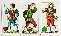 Players use the standard German-suited pack found in most of Austria and referred to as the Tell pattern by the International Playing-Card Society. This comprises 32 cards ranking from 7 to Deuce (Ace) in the suits of Acorns (Eichel), Leaves (Laub), Hearts (Herz) and Bells (Schell).