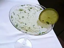 The gimlet (/ˈɡɪmlət/) is a cocktail made of gin and lime cordial. A 1928 description of the drink was: gin, and a spot of lime.[1] A description in the 1953 Raymond Chandler novel The Long Goodbye stated that "a real gimlet is half gin and half Rose's lime juice and nothing else."[2] This is in line with the proportions suggested by The Savoy Cocktail Book (1930), which specifies one half gin and one half lime juice.[3] Some modern tastes are less sweet, and generally provide for up to four parts gin to one part lime cordial.[4]