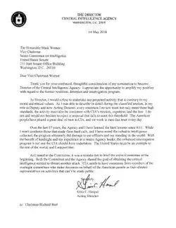 On May 14, Haspel sent a letter to Senator Mark Warner of Virginia stating that, in hindsight, the CIA should not have operated its interrogation and detention program.[71] Shortly thereafter, Warner announced he would back Haspel when the Senate Intelligence Committee voted on whether to refer her nomination to the full Senate.[71]