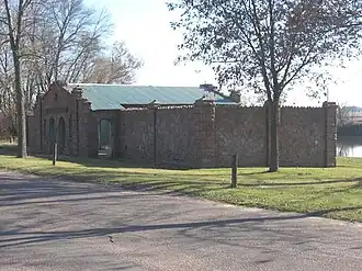 At the turn of the century, the City of Dell Rapids began drawing up plans for a public park along the Big Sioux River.[2] This park was completed and opened in 1913.[3] A bathing beach was also added at this time, for which Gina Smith Campbell had raised the funds to construct. This beach was widely popular, drawing thousands of visitors from across the region to the park every year. Early bathhouses at the park were temporary wooden structures.[2] Under the direction of the City of Dell Rapids and its park board, the permanent stone bathhouse was completed in 1934. Designed by P. L. Peterson and constructed by workers from the Civil Works Administration, the building was dedicated to Campbell upon its completion. The bathhouse contained private showers and bathroom facilities.[4] Although the beach closed in 1960 after the construction of a dedicated swimming pool,[5] the bathhouse has survived and now functions as a covered picnic shelter. It was added to the National Register of Historic Places on February 13, 1986, for its architectural detail and its association with the Civil Works Administration.[4]