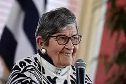 Ginette Kolinka (born Ginette Cherkasky; 4 February 1925) is a French Holocaust survivor. When her father and brother were taken away to be killed by poison gas, shortly after the train on which they had been transported arrived at Auschwitz, she was selected for factory work and taken to the women's camp. Released in May 1945, she remained silent about her war-time experiences for half a century. Her own explanation for this is that she did not wish to irritate people. Whatever the truth of that, after her husband died, and soon after the dawn of a new century, she became an energetic "ambassador for the memory" of those times, criss-crossing the country to share her holocaust knowledge with school children and students. Thanks to the ensuing media exposure, it is no longer only among children and students that, during the first decades of the twenty-first century, she has heightened awareness of the Shoah and its lessons.[1][2][3][4]