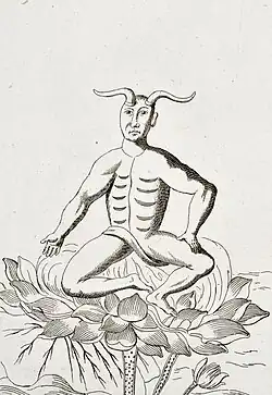 A copperplate engraving of Japanese deity “Giwon” by Bernard Picart, circa 1728.