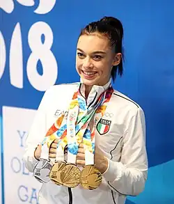 - ^ "Ginnastica, Olimpiadi Giovanili 2018: Giorgia Villa chiude col botto, Campionessa al corpo libero! Tris di ori, ora si vola tra le grandi". OA Sport (in Italian). October 16, 2018.