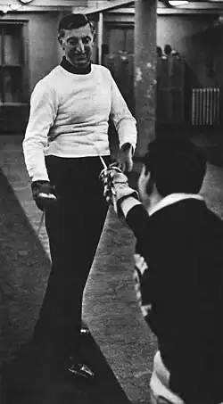 Maestro Santelli immigrated to the U.S. in 1924. He initially taught his art at the New York Athletic Club, before founding Salle Santelli in New York City. Giorgio was US National Coach for several decades, and U.S. Olympic Coach in 1928, 1932, 1936, 1948, and 1952. He trained many national team members and champions from the 1940s through the 1980s, teaching champions and prominent fencers including George Worth, Tibor Nyilas, George Kolombatovich, Allan Kwartler, Neil Lazar, Uriah Jones, Robert Russell, Anne O'Donnell Russell, Marty Lang, Denise O'Connor, Ed Ballinger, Israel Colon, Ernest Schmatolla, Maurice Kamhi, Andy Shaw, Ed Wright, and many others. Others who fenced at Salle Santelli included Olympians Norman Lewis, Robert Blum, Ralph Goldstein, Albert Axelrod, and Zaddick Longenbach.
