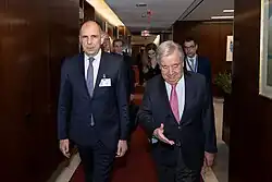 On 28 September 2023, Gerapetritis concluded a visit to New York where he participated in the Seventy-eighth session of the United Nations General Assembly.[67] During his visit, he met with President of the UN General Assembly, Dennis Francis, Secretary General Marija Pejčinović Burić, and EU Commissioner for Home Affairs Ylva Johansson, amongst other officials. He also accompanied Mitsotakis to meet UN Secretary General António Guterres and also promoted the candidacy of Greece in the 2024 United Nations Security Council election on his visit.[67] He also met with the Turkish Minister of Foreign Affairs, Hakan Fidan, and also attended a meeting between Recep Tayyip Erdoğan and Prime Minister Mitsotakis.[67]