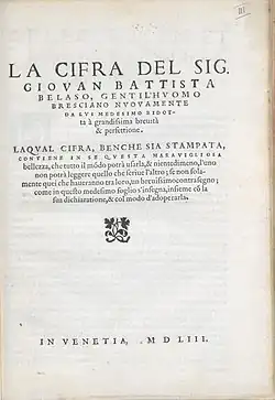 - Bellaso, Giovan Battista, La cifra del Sig. Giovan Battista Bel[l]aso, gentil’huomo bresciano, nuovamente da lui medesimo ridotta à grandissima brevità et perfettione, Venetia 1553.