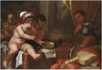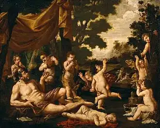 Podestà made prints after the bacchanals of Titian, which he dedicated to powerful patrons. He dedicated a series of prints to the pleasures of wine to Paolo Giordano Orsini II, Prince of Bracciano. Orsini also owned multiple paintings by Podestà, including two landscapes and seven small paintings of seafood.[1] A Worship of Venus etched after Titian was dedicated to Cassiano dal Pozzo and other prints of bacchanals to Fabio della Cornia. The artist clearly tried tocurry favour with the Barberini family through these dedications.[3] Cassiano dal Pozzo was known for his archaeological interests. Podestà's acquaintance with Cassiano dal Pozzo may have played a role in Podestà’s artistic development and may have put him in the circle of Poussin. This circle included Flemish artists such as the sculptor François Duquesnoy and the painter Karel Philips Spierincks who at one time or the other shared a home in Rome and also had common artistic interests.[4][5] In this circle there was an interest in Classicism as well as a growing interest and admiration for the bacchanals of Titian. This found expression in copies and reproductions after Titian as well as new compositions inspired by the theme of the bacchanals. The mutual influence of the artists in this circle is clear from the fact that Podestà 's Bacchus and Ariadne (At Arte Antico) cites in the putto who scares another putto with a mask similar figures in a Drunken Silenus of the Flemish painter Karel Philips Spierincks.[4]