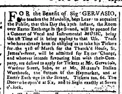 Giovanni Battista Gervasio (c. 1725 - c. 1785) was an Italian musician and composer. Born in Naples he was one of the first generation of virtuoso-mandolinists who left Italy and played the mandolin in Europe in the 18th century.[1][2] He was a composer for the mandolin and his works can be found scattered in 18th century collections such as the Gimo music collection and the Bibliothèque Nationale de France.[3][4] He also wrote a mandolin method Methode facile pour apprendre a quatre cordes, instrument pour les dames (Easy method for learning four-string instruments for ladies), published in Paris in 1767.[5] He performed in London 1768 and in Frankfurt-on-the-Main on December 10, 1777, and the Concert Spirituel in Paris on December 24, 1784 .[1][5] He advertised in 1785 that he was master of singing and mandolin to Her Royal Highess, the Princess of Prussia.[5] A work of music addressed to her exists today in the Bibliothèque Nationale de France.[3]