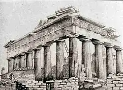 Lusieri was employed by Lord and Lady Elgin even though he was not able to speak English. The contract was drawn up between them in French, and Lusieri was to be paid £200 per year.[5] Lusieri had been the Court Painter to the King of Naples and Elgin's secretary, William Hamilton, had written to the King to ask permission to employ his painter.[6] Lusieri was originally employed to create sketches for Elgin of Greek antiquities. Lusieri was empowered to also employ moulders who were to create casts of Greek sculptures.[5] Elgin however found that marble sculptures were missing and that they had allegedly been destroyed. It was Lusieri who persuaded the reluctant Elgin to remove the sculptures in order to protect them from local Turkish opportunists, who were breaking off bits to sell to tourists.[6] In 1801 Elgin had Lusieri supervise the removal of the sculptures at a cost of £70,000.[7][8]