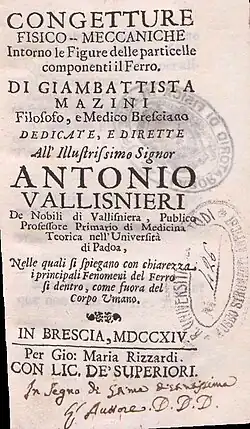 - Congetture fisico-meccaniche intorno le figure delle particelle componenti il ferro (in Italian). Brescia: Giovanni Maria Rizzardi. 1714.