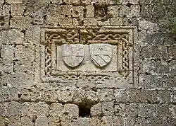 Tomb of Jean-Baptiste des Ursins, Rhodes. Musée de Cluny.Image of the young 39th Grand Master of the Order of the Knights Hospitalier, 1467 - 1476, Giovanni Battista Orsini, (circa 1450 - 1503), Abbot of the Benedictine Monastery of San Salvadore Maggiore, diocese of Arezzo, since August 1477, Cardinal deacon since November 1483, participant in the conclaves of 1484 to elect Pope Innocent VIII and 1492 to elect Pope Alexander VI, but his properties were confiscated by such Pope, the father of Cesare Borgia, in January 1503, dying in prison, probably poisoned according to some pamphlets, on 22 February 1503Coat of Arms of J.B. des Ursins, Grand-Master, on the walls of the castle at Rhodes, Greece.