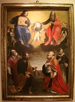 For the church he painted what was once the main altarpiece with Saint Anthony Abbot, Francis Xavier, and Ignatius Loyola. He also painted five other canvases of Saints for the church. For the parish church of San Bartolommeo, he painted an Apostle and a Madonna del Soccorso, as well as Saints Jerome and Stephen. He painted a Virgin with Saints Donino and Alberto for the first chapel on the left of the church of Phillip Neri. He also painted in the Convent of San Domenico.[1]