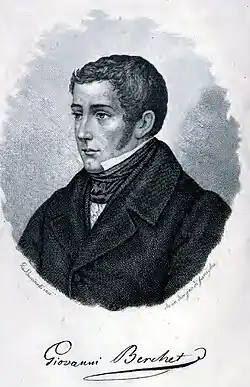 Giovanni Berchet (Italian pronunciation: [dʒoˈvanni berˈʃɛ]; 23 December 1783 – 23 December 1851) was an Italian poet and patriot. He wrote an influential manifesto on Italian Romanticism, Lettera semiseria di Grisostomo, which appeared in 1816, and contributed to Il Conciliatore, a reformist periodical.