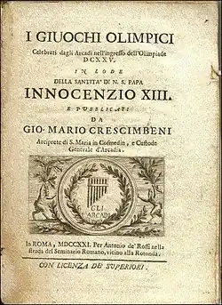 - ^ a b c d One or more of the preceding sentences incorporates text from a publication now in the public domain: Chisholm, Hugh, ed. (1911). "Crescimbeni, Giovanni Mario". Encyclopædia Britannica. Vol. 7 (11th ed.). Cambridge University Press. pp. 411–412.