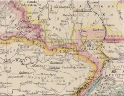 Miani returned to Egypt with an agreement to accompany a trading company in an expedition to the Mangbetu region in search of ivory.[1] He set out again for the South at the age of 61, although his health was poor.[8] The expedition left Khartoum on 15 May 1871, but was delayed for three months at Gaba-Shambil at latitude 7°N.[1] He arrived in Lao in August, where he stayed until mid-September, and was with the Ajar tribe in October, then passed the month of Ramadan at Farial on the Rohl. From there, he turned south through Mittu country, crossing the zéribas of Nganna, Nyoli, Reggo, Urungana, and in the Luba country the zéribas of Mundu people on the Issu, a tributary of the upper Tonj River.[9]