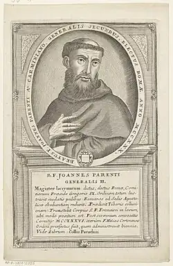 Giovanni Parenti O.F.M.[a] (died 1250) was an Italian Friar Minor and St. Francis of Assisi's successor as head of the order. With a legal background, he served as Minister Provincial in Spain before being chosen Minister General in 1227. Parenti held a literal interpretation of poverty as it applied to the order; a view that was not shared by everyone. He stepped down in 1232 and was succeeded by Elias of Cortona.