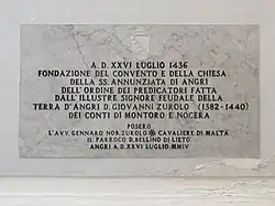 He was the founder of the former convent of the Dominican preaching fathers, with the adjoining church of the SS. Annunziata della Terra d'Angri (actually in place Annunziata), on a previous chapel also dedicated to the SS. Annunziata. The notarial deed drawn up before the major church (later Collegiate) of Angri was executed on 26 July 1436.[24][25][26][27]