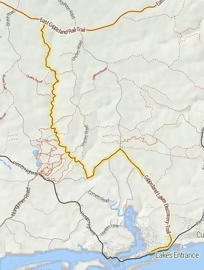 - ^ a b "Gippsland Lakes Discovery Trail (Mississippi Creek Trail) - Trail Description". Railtrails Australia Website. Railtrails Australia, Inc. Retrieved 14 March 2009.