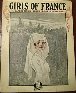 "Girls of France" is a World War I era song released in 1917. Al Bryan and Edgar Leslie wrote the lyrics. Harry Ruby composed the music.[1][2] The song was published by Waterson, Berlin & Snyder Co. of New York, New York. Artist Albert Wilfred Barbelle designed the sheet music cover. It features a nurse in the foreground, and soldiers marching behind her.[3] It was written for both voice and piano.[4][5]