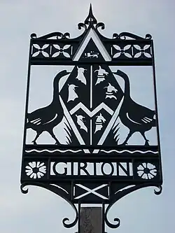 The current village sign, situated on the corner of Redgate Road and Cambridge Road, was erected in 1985 after a fund-raising campaign. Designed by Denis Cheason and made by Barry Sharman, the silhouette design is formed from a number of separate images. The top part of design is based on a Roman belt discovered in a burial ground near Girton College. The centre is derived from the family coat of arms of Anne-Maria Cotton, who endowed the first Girton village school, together with geese, kept at Washpit, that provided quills for use in the University of Cambridge. The flowers near the village's name are corn marigolds which were once common in the village, and at the base is the cross of Saint Andrew to whom the parish church is dedicated. [7]