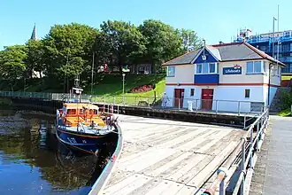 There were few lifeboats in south west Scotland in the 1850s but the RNLI had stationed one at Ayr in 1859.[1] In 1865 decided that Girvan would also be a good place for a lifeboat. There were many fishermen who would be able to provide a crew, and a road close to the coast both north and south of the town would allow it to be transported to other places where it could be launched when required. The new boat was paid for by Alexander Kay, an insurance broker in Glasgow, and a boathouse was built on land donated by the Duchesse de Coigny.[2]