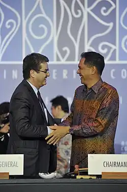 Wirjawan was appointed as Minister of Trade of Indonesia in October 2011. One of his biggest accomplishments in this role was becoming chairman of the Ninth World Trade Organization Ministerial Conference of 2013 held in Bali 3–7 December 2013, leading the 159 members of the WTO to agree to a package to ease international trade barriers.[7] Also notable was that under his leadership, trade law was finally passed by the House of Representatives on 11 February (or Jan 31, 2014), a new milestone for the country after 80 years of using the previous Dutch-era law.[8]