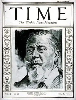 For his accomplishments, Gatti-Casazza was one of the first Italians (and the first Italian living in the United States) to be featured on the cover of Time magazine. He appeared on the weekly's cover twice; on 5 November 1923, and again on 1 November 1926.[2]