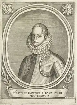 - Fabrizio Pignatelli, 3rd Prince of Noia (1604–1664), who married Girolama Pignatelli, Duchess of Monteleone, a daughter of Héctor Pignatelli y Colonna, 4th Duke of Monteleone, and Caterina Caracciolo y Mendoza (a daughter of Carlo Caracciolo, 6th Count of Sant'Angelo).[7]