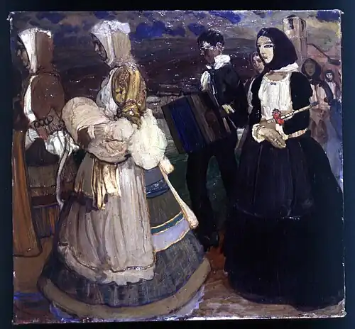 While pursuing classical studies in accordance with his family’s wishes, Biasi became well known in his hometown for caricatures published in local humorous journals when he was still very young. His drawings kept up to date with the latest French and above all Mitteleuropean models and achieved considerable success also beyond the national borders. He contributed to the most important Italian magazines of the period, including L'Illustrazione Italiana, Avanti della Domenica and Il Giornalino della Domenica, and finally established himself as the illustrator of Grazia Deledda, with whom he shared a determination to assert the specific values of Sardinian culture in post-unification Italy. He also began painting, primarily folkloristic depictions of his homeland but informed by an awareness of the latest developments in European painting, with which he came into contact very early through the shows of the Secessione Romana movement and the Venice Biennale, where he made his debut at the Esposizione Internazionale d’Arte della Città di Venezia in 1909. Participation in exhibitions in Rome and Milan was interrupted only for the short period when he served as a volunteer in World War I. The period 1924–26 saw a number of journeys to North Africa in search of ways to revitalise his means of expression. An interest in decoration and experimentation with mosaic and fresco techniques developed in the 1940s.