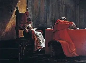 His first exhibitions came in the 1860s; notably a depiction of Galileo appearing before the Holy Office, which was shown at the Society for the Promotion of Fine Arts in 1865. His rendering of Eleonora Pimentel Fonseca being led to the gallows was shown at the Royal Palace in 1868. Several more major works were displayed at the Society during the 1870s, including Sortilege (1874)[2] and Maga (Sorceress, 1877).[3] That same year, he exhibited The proscriptions of Sulla and Agrippina spies on the Senate, at the Galleria dell'Accademia.[4]