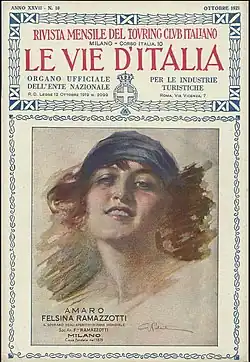 Palanti was an eclectic artist, notably producing oil paintings, preferring portraits and nudes,[13] as well as landscapes and waterscapes. He also worked with decorative arts, including fabric design, ceramics, stained glass, wrought iron, metal objects and furniture.[14] He was an illustrator who produced graphics for posters and book covers, in addition to creating sketches for costume and set design for the Teatro alla Scala. In later life, he worked as an architect and urban planner, integral to the design of the seaside town Milano Marittima.[14] His modernity looked to the strength, safety and joy of a middle and upper bourgeois class at the beginning of the twentieth century: industrialists, professionals, ladies of high society, who enjoyed a confident pre-war Italy in economic growth.[3] Almost all of his activity, over the years, was oriented towards applied art, without however encroaching on a purely technical style, as in the case of graphics, inclined as he was instead to decorative solutions expressed in pictorial terms. Rich and multifaceted interventions in the so-called minor arts, from designs for fabrics to ceramics from Faenza, to stained glass windows, to wrought iron, to the applications of leather and metals for Ceruti furniture, to collaborations with the architect Gaetano Moretti. The creation of decorative paintings on bookshelves or furniture doors.
