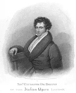 Giuseppe de Begnis (1793-10 August 1849) was an Italian operatic bass singer.[1] Born in Lugo di Romagna, he started his musical education when he was 7 years old, under Padre Bongiovanni, and sang soprano in the church. At age 15 he had serious problems with his voice and began studying acting under Mandini, a famous actor of the time. His father did not want Giuseppe to become a comedian and in due course the young man became a pupil of the composer Giovanni Morandi, the husband of the singer Rosa Morandi. [2]