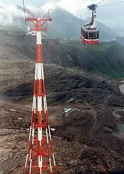 Until 2017 when the new Seilbahn Zugspitze cable car opened, the tallest aerial tramway support pillar in the world was this 113.6 metres (373 ft) high steel framework construction, placed on a square concrete block with 17 metres side length, which stands on a rock tooth. The construction consists of a central steel tube with a diameter of 2.2 metres, in which there is a maintenance elevator and a ladder. This pipe is supported by eight tubes of 0.5 metres diameter, connected every 10 metres with the central tube. This pylon was 103 metres tall when built in 1966. It has been extended twice, first to 106.8 metres and then to 113.6 metres.