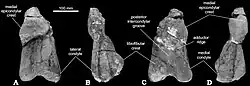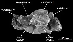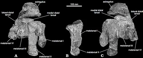 The astragalus is low and elongate from across side to side and the medial portion lacks the craniocaudally broadening compared to the lateral portion, a trait found in most non-eusauropods. The astragalus is weakly convex at the lower end, though this is not as extreme as in Blikanasaurus and Lessemsaurus. The upper surface of the astragalus is softly convex because it is where the lower end of the tibia (shin bone) articulates with the astragalus. This surface is pierced by two foramina (small openings in bone) that have been interpreted as vascular foramina. The ascending process (protrusion of bone) is mound shaped and its upper articular surface faces proximomedially. The distal tarsals have a laterally elongated triangular shape in when seen from their top ends. The corners of the tarsals are rounded and bulbous, especially in the posteromedial corner. The medial distal tarsal is not confined solely to metatarsal III, but also barely contacts the proximal end of metatarsal II, like in Saturnalia. The lateral distal tarsal has a quadrangular shape and was likely longer mediolaterally than proximodistally.[3]