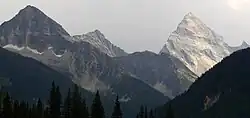 The Columbia Mountains rise from the plateaus of the Central Interior and extend eastward to the Rocky Mountain Trench. Geologically distinct from the nearby Rockies, the range is divided into four sub-ranges: the Cariboos, Monashees, Selkirks, and the Purcells. Glacier encompasses a portion of the northern Selkirks and a narrow strip of the northern Purcells. The topography of the park varies between rounded mountains and ridges in the east, north, and west, and sharp, steep-sided peaks in the central and southern regions. A.O. Wheeler measured many of the park's mountains in 1901 and 1902 using a complex system of fixed points and photographs.[16] In the early 20th century, the area was referred to as the "Canadian Alps".[17] Most names are from historical figures, including explorers, surveyors, mountaineers, and railway and Hudson's Bay Company executives.