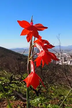 Gladiolus watsonius is a Gladiolus species found in the granite slopes of Southwest Cape, South Africa.[2]