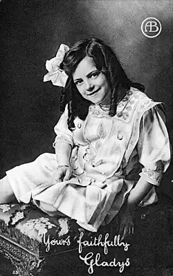 Gladys Egan (also credited as Gladys Eagan; May 24, 1900 – March 8, 1985) was an early 20th-century American child actress, who between 1907 and 1914 performed professionally in theatre productions as well as in scores of silent films. She began her brief entertainment career appearing on the New York stage as well as in plays presented across the country by traveling companies. By 1908 she also started working in the film industry, where for six years she acted almost exclusively in motion pictures for the Biograph Company of New York. The vast majority of her screen roles during that period were in shorts directed by D. W. Griffith, who cast her in over 90 of his releases.[1][2] While most of Egan's films were produced by Biograph, she did work for other motion-picture companies between 1911 and 1914, such as the Reliance Film Company and Independent Moving Pictures. By 1916, Egan's acting career appears to have ended, and she no longer was being mentioned in major trade journals or included in published studio personnel directories as a regularly employed actor. Although she may have performed as an extra or in some bit parts after 1914, no available filmographies or entertainment publications from the period cite Egan in any screen or stage role after that year.[3]