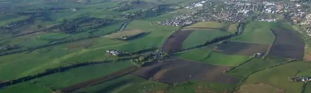 The fortlet (55°55′53″N 4°11′03″W / 55.9314°N 4.1842°W) can sometimes be seen in photographs taken from aircraft which have been taken at various times since 1955.[7] Nothing identifiably Roman can be seen at the site anymore.[8] There have been no excavations to date. Aerial photography has however highlighted an area of around 20 m square, which could have been secured with the help of the turf rampart with its ditch. It has been speculated that a bridge, across the ditch, may have granted admission to the frontier. The site of the fortlet is just east of the bridge over the Forth and Clyde Canal which carries the A803. Kirkintilloch is east of the site with Low Moss to the south.[9] There is a temporary Roman camp at Easter Cadder about one-half mile (one kilometre) away. This is on a raised piece of ground approximately mid-way between the Glasgow Bridge fortlet and the main Roman fort at Kirkintilloch.[10] If walking west, the line of the Wall changes course after the site of Glasgow Bridge Fortlet.[11]